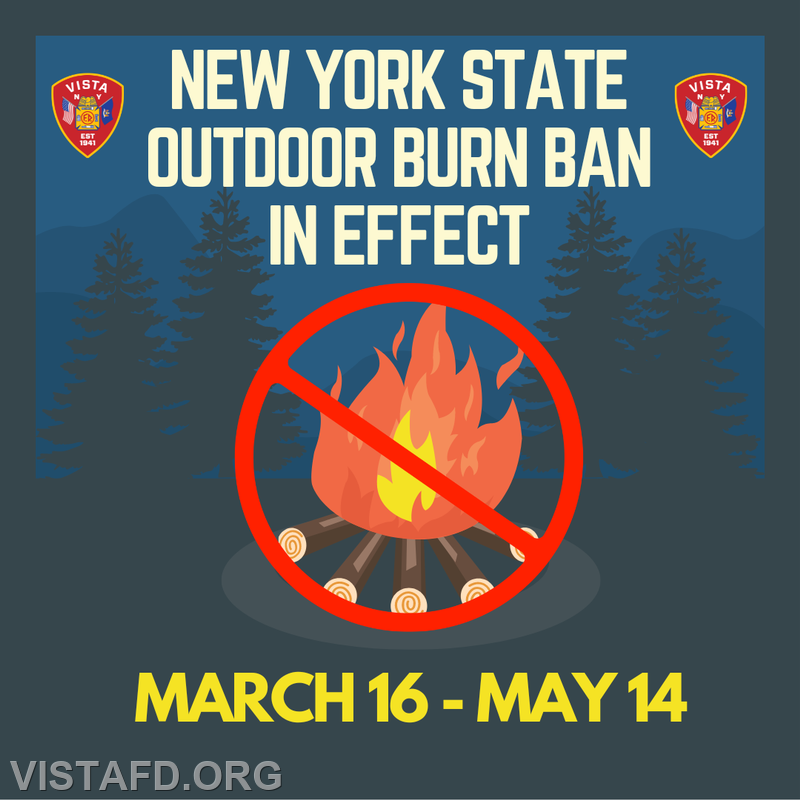 The New York State annual outdoor burn ban is in effect from March 16th through May 14th. During this time, open burning of brush and debris is prohibited to help prevent wildfires and protect our community.